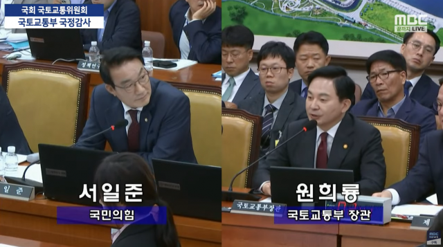 국민의힘 서일준 국회의원(왼쪽)은 지난 10일 오후 열린 국회 국토교통위원회 국감에서 원희룡 국토교통부 장관을 상대로 관련 질의를 진행했다. 의원실 제공