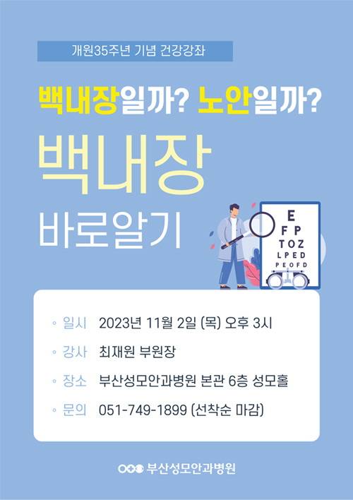 부산성모안과병원이 개원 35주년을 기념해 11월 2일 오후 3시 병원 본관에서 안질환 시민 무료 강좌를 연다. 최재원 진료부원장이 ‘백내장일까, 노안일까? 백내장 바로 알기’라는 주제로 강의한다.