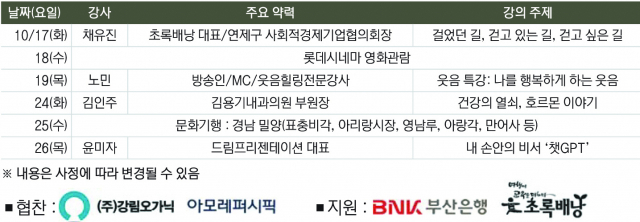 부산일보사는 '제262기 부일여성대학'을 개최합니다. 여성의 소양 함양과 자기 계발을 위해 마련된 이번 262기 강좌는 명강사의 강의와 영화관람, 문화기행으로 2주간 진행됩니다. 주체적인 삶을 추구하는 여성 여러분의 많은 참여 바랍니다. 〈강의순〉