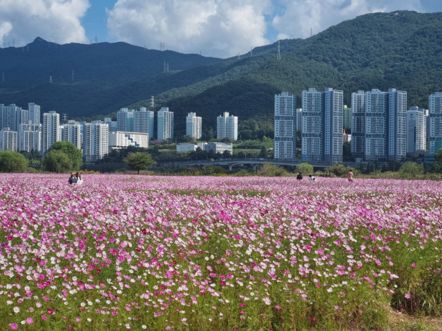 가을 전령 코스모스가 경남 김해시 대동생태체육공원을 화려하게 수놓았다. 공원 내 8만 2700㎡ 부지에는 코스모스 이외에도 야생화 단지 등 아름다운 자연을 만끽할 수 있는 자연녹지 공간이 마련돼 있다. 김해시 제공