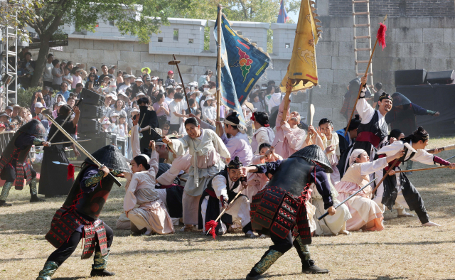 15일 부산 동래구 동래읍성 일대에서 열린 동래읍성 역사축제에서 임진왜란 당시 동래성 전투를 재현한 뮤지컬 공연이 진행되고 있다.