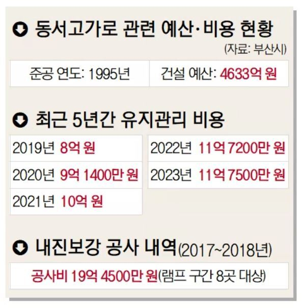앞서 동서고가로 건설에는 4633억 원(1995년 준공·10.6km 구간)이 투입된 바 있다. 또 2019년 이후 최근 5년간 유지관리비로 연간 약 10억 원의 비용이 들었다. 이와 함께 내진보강 공사에 2017년과 2018년에 걸쳐 19억 4500만 원의 예산이 소요됐다.