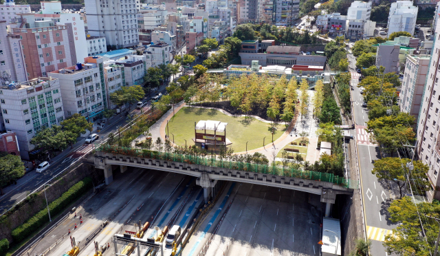 부산 부산진구 수정터널 입구 상부를 덮어 피해를 보던 주민에게 돌려준 감고개공원 전경. 도로 위 공간을 활용한 성공 사례로 꼽히는 이곳처럼 동서고가로에도 엘리베이터나 계단 등 수직 연결 통로와 인근 건물과 연결한 보행교량 등이 설치되면 시민들이 새롭고 창의적인 공간으로 활용할 수 있다는 의견도 있다. 정종회 기자 jjh@