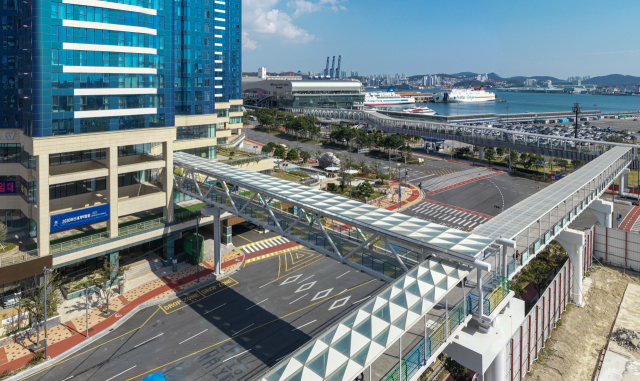 부산 동구 초량동 ‘협성마리나G7’ 상업시설과 부산역을 연결한 보행교. 동서고가로와 인근 아파트, 건물 사이에도 이런 통로를 설치할 수 있다. 김종진 기자 kjj1761@