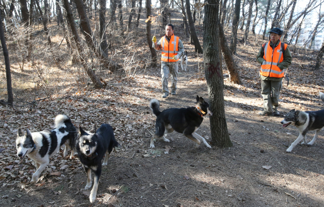 유해조수 포획단이 부산 사하구 신평동 동매산 기슭에서 멧돼지를 수색하고 있다. 사진은 기사와 관련 없음. 부산일보DB