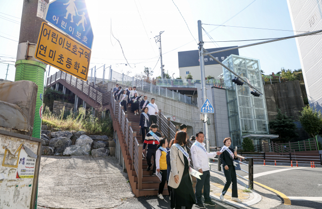16일 부산 연제구 연미초등학교 통학로에서 학부모들과 연제구청, 연제경찰서, 도로교통공단이 함께 통학로 주변 어린이 보호구역과 교통안전시설을 점검하는 ‘다 같이 돌자! 안심학굣길’ 행사가 열렸다. 이번 점검에서는 안전 표시 설치 여부와 안전 펜스 관리상태, 안전 사각지대 등을 집중적으로 확인해 개선에 반영할 계획이다.
