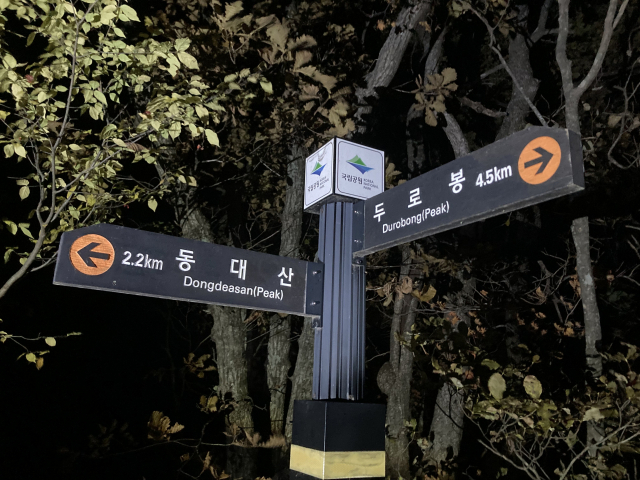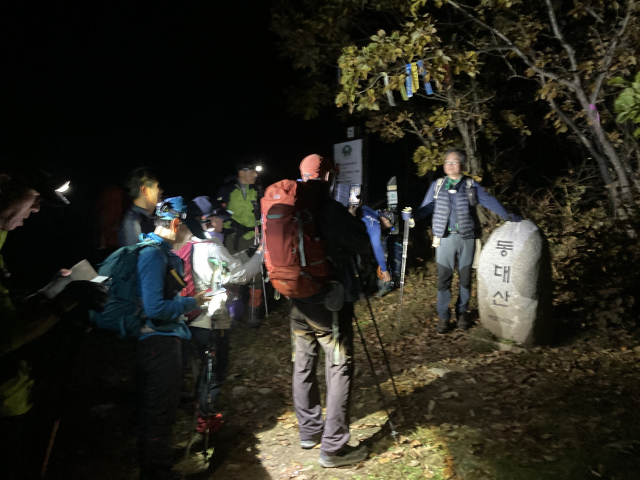 깜깜한 어둠 속에서 동대산 정상석을 배경으로 사진을 남기지만, 사위는 검다.