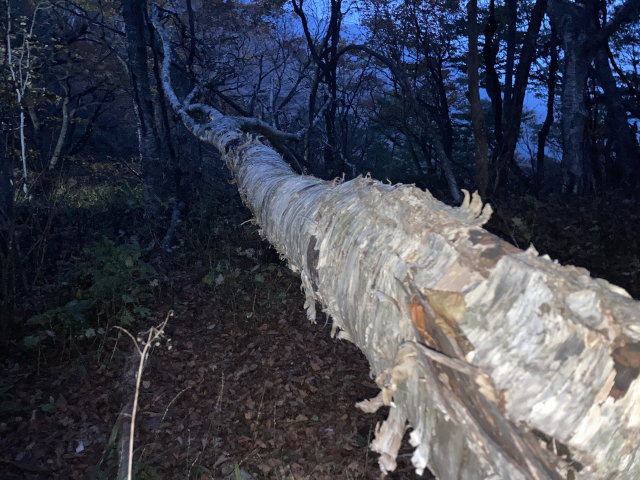 동쪽이 서서히 밝아오고 있다. 쓰러진 물박달나무 곁을 지난다. 주변이 밝아오자 가장 먼저 눈에 띄는 것이 붉게 물든 단풍이다. 물박달나무의 흰 수피와 묘하게 대비되는 강한 색상이 지금의 계절을 규정하라고 재촉한다. 가을인가? 여름의 끝자락. 아니다 이곳은 깊은 가을이고 어떤 곳은 초겨울이라고 해도 좋다. 대간은 계절이 반 박자 정도 앞서가는 모양이다.