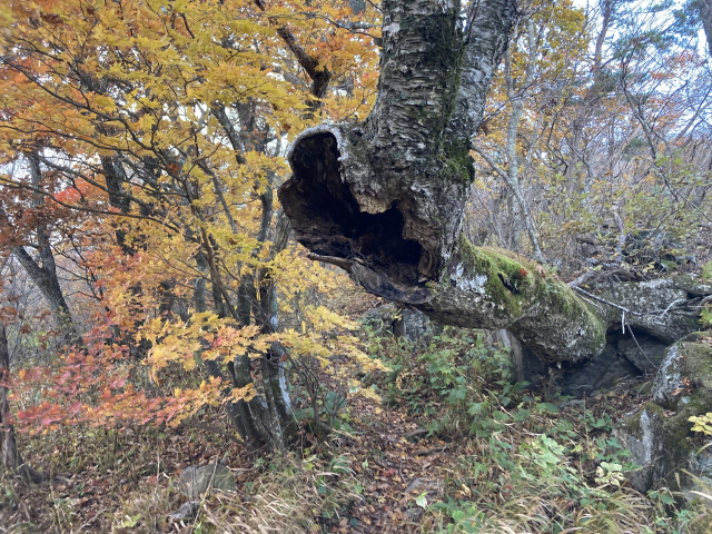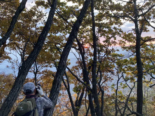 밝아온 빛이 저마다의 색깔을 뽐내는 나뭇잎을 깨우치니 온산이 울긋불긋 물들었다. 이미 떨어진 잎은 잎대로, 선선한 새벽바람에 흔들리는 노랗고 붉은 단풍은 또 그대로 아름답다. 오래된 숲에서 볼 수 있는 고사목과 나무둥치가 뻥 뚫린 고목이 산꾼에게 연거푸 인사한다. 그들의 안부를 물어야 하는데 갈 길이 멀어 묵례만 하고 지난다.