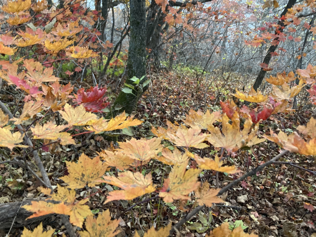 해가 뜨자 온통 붉고 노란 단풍이 주위를 에워쌌다. 부산에서 덥다가 시원하다가 변화무쌍한 미궁의 계절 속에서 살다 왔는데, 오대산은 이미 겨울 준비를 마치고 있었다. 절정이라고 해도 좋을 단풍이다. 올해는 단풍이 좋지 않다지만, 해발 1000m를 넘는 백두대간은 달랐다. 특히 노란 단풍이 많은 오대산은 몽롱한 늦가을을 만끽하게 했다. 바람이 세찬 구간은 잎을 다 떨구고 이미 겨울 채비를 한 나무도 있다. 산행 막바지에 겨울을 재촉하는 비를 맞으니, 손이 시렸다. 모든 것을 버리지만, 또 새로움을 준비하는 계절이 오고 있다. 겨울이다.