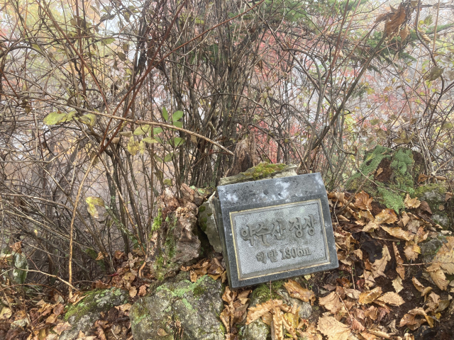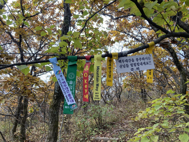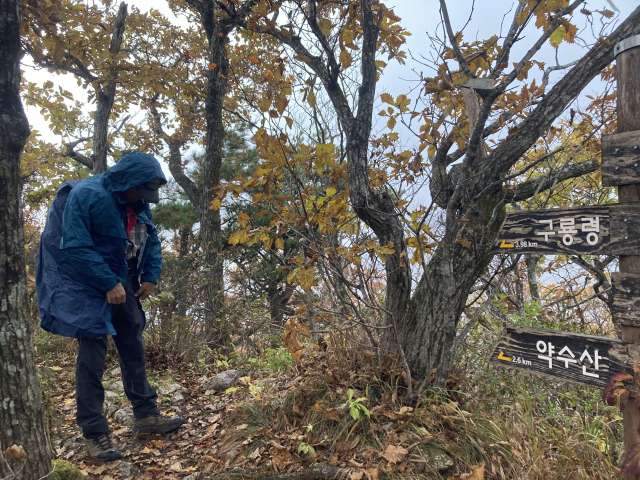 약수산을 2.6km 정도 앞에 두고 제법 굵은 비가 내리기 시작한다. 산행 전날 예보를 봤을 때 1시부터 비가 올 것이라고 했다. 기상예보가 어지간히 맞다. 모두 비옷을 꺼내 입었다. 모자챙에서 낙숫물이 뚝뚝 떨어진다. 겨울을 재촉하는 비치고는 제법 거세다. 빗줄기에 단풍이 든 잎사귀도 우수수 떨어진다.