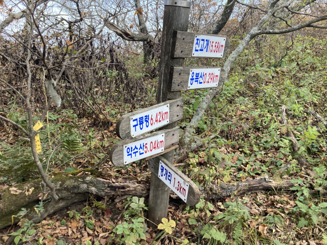 응복산에 도착했다. 이곳 일대의 정상석은 돌이 아니라 금속판으로 돼 있다. 산세가 하도 험한 곳이라 운반하기 좋도록 그리 만들었는가 보다. 오늘의 목적지인 구룡령까지는 6.71km가 남았다는 오래된 이정표가 있다. 산꾼들의 지도에는 대략 6.8km로 안내돼 있다.