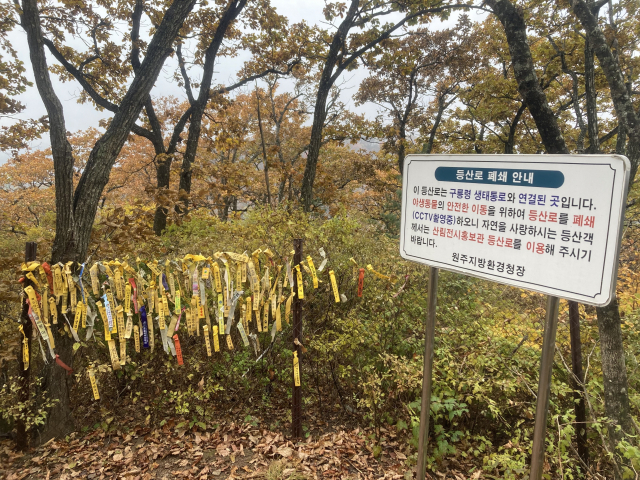 구룡령 터널 인근의 생태통로 출입금지 안내문. 철망엔 대간꾼들의 흔적이 빼곡하다.