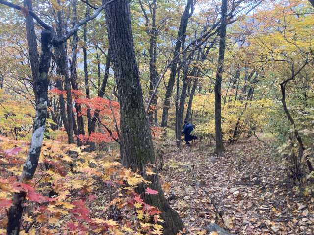 구룡령으로 내려가며 사진을 찍기 위해 명용익 산행대장을 앞세웠다. 고도가 낮은 곳의 단풍이 더 보기 좋다.