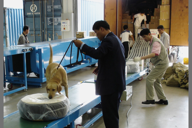 부산본부세관 직원들이 마약 탐지견과 함께 컨테이너 화물을 검사하고 있다. 부산일보DB