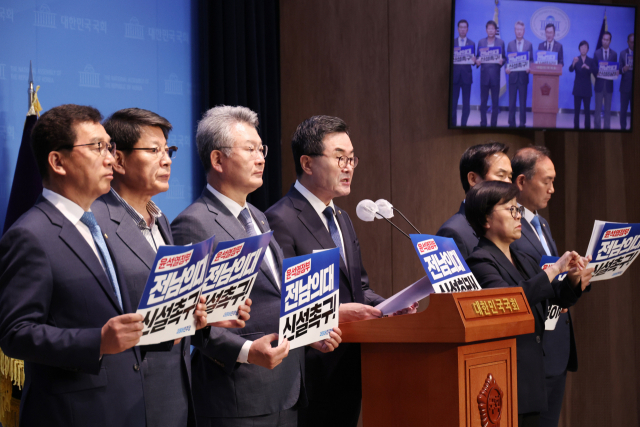 17일 국회에서 더불어민주당 소병철 의원 등 전라남도 지역구 의원들이 전남 지역 의대 신설을 촉구하는 기자회견을 하고 있다. 연합뉴스