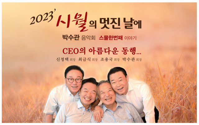 이날 행사에는 헌신적인 봉사로 지역 사회를 이끄는 부산의 대표 기업가인 신정택 (주)세운철강 회장, 최금식 (주)선보공업 회장, 조용국 코렌스 그룹 회장도 게스트로 무대에 올라 노래하며 박 회장의 음악회를 축하할 예정이다.