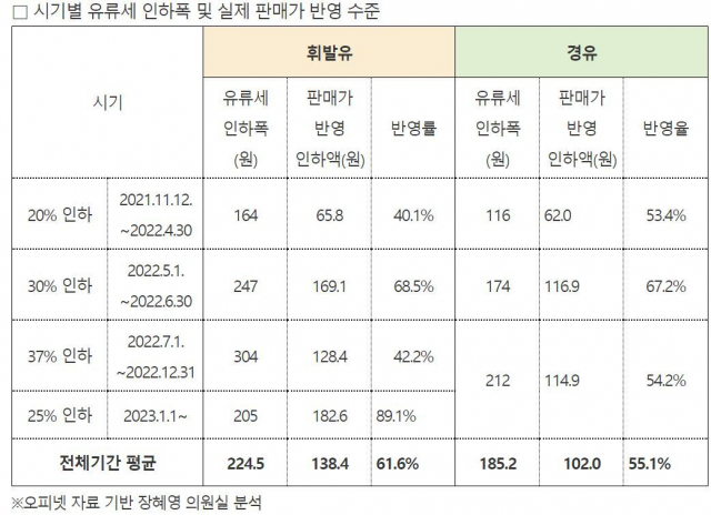 19일 국회 기획재정위원회 소속 정의당 장혜영 의원이 지난 2년간 유류세 인하효과를 분석한 결과에 따르면, 2021년 11월부터 현재(10월 13일)까지 휘발유와 경유 유류세 평균 인하액은 각각 L(리터)당 225원 ,185원이고, 이 가운데 각각 138원(61%), 102원(55%)만 주유소 판매가에 반영된 것으로 추산됐다.