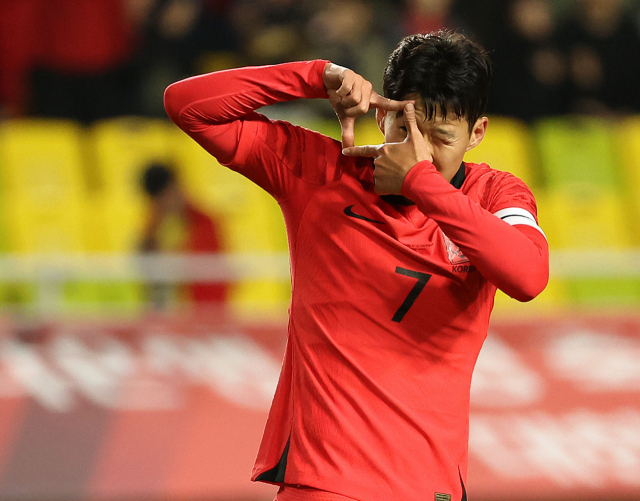 한국 축구 국가대표팀의 손흥민이 지난 17일 경기도 수원월드컵경기장에서 열린 베트남과의 평가전에서 골을 넣은 뒤 특유의 ‘찰칵 세리머니’를 하고 있다. 연합뉴스