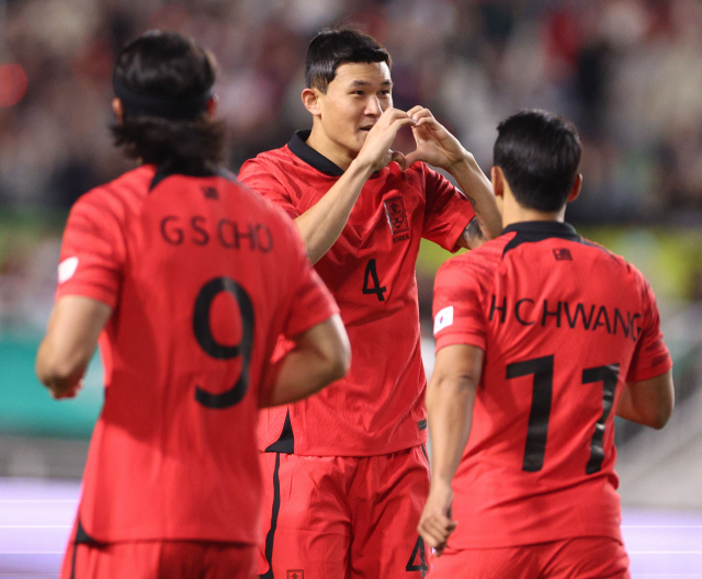 한국 축구 국가대표팀의 김민재가 지난 17일 경기도 수원월드컵경기장에서 열린 베트남과의 평가전에서 선제골을 넣은 뒤 팬들을 향해 하트 세리머니를 하고 있다. 연합뉴스