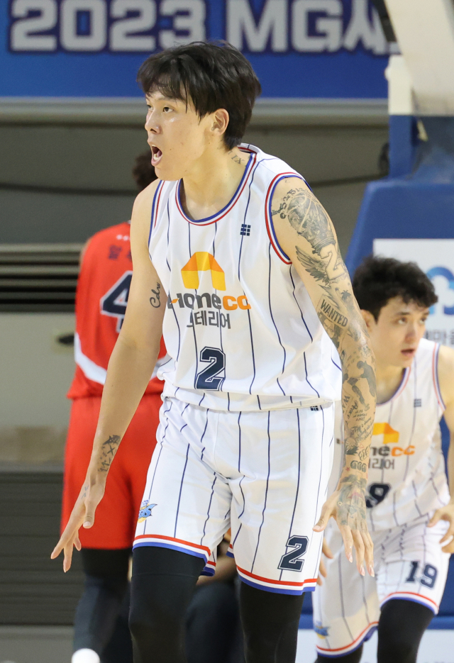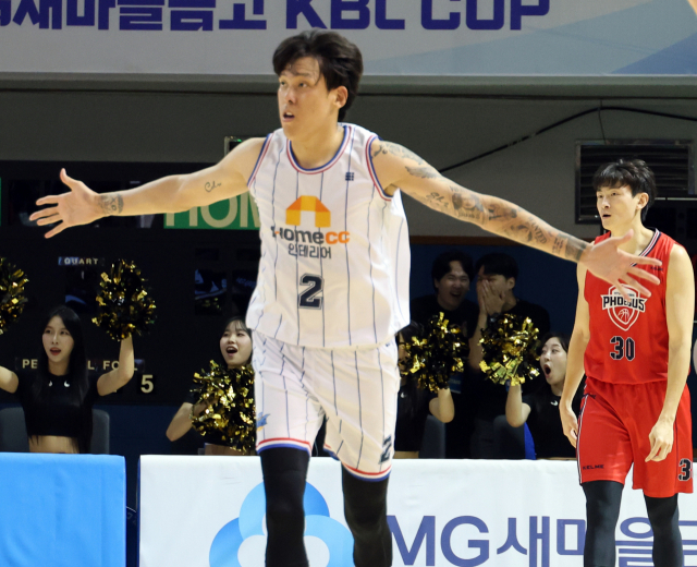 지난 15일 전북 군산월명체육관에서 열린 부산 KCC와 울산 현대모비스의 '2023 MG새마을금고 KBL 컵대회' 결승에서 부산 최준용이 골을 넣고서 환호하고 있다. 최준용은 지난 시즌이 끝난 뒤 KCC와 입단 계약을 맺었다. 연합뉴스