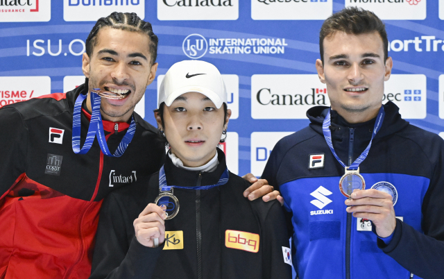 23일(한국시간) 캐나다 몬트리올에서 열린 2023~2024시즌 국제빙상경기연맹(ISU) 쇼트트랙 월드컵 1차 대회 남자 1000m 2차 레이스에서 우승한 김건우(가운데)가 시상식에서 기념 촬영을 하고 있다. 루카 스페첸하우저(오른쪽·이탈리아)와 윌리엄 단지누(캐나다)가 2,3위를 차지했다. AP연합뉴스