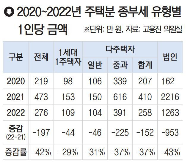 지난해 종부세 부담자 1명당 평균 종부세는 276만 원으로 전년(473만 원)보다 42%(197만 원) 감소했다. 유형별로 다주택자와 법인의 종부세가 1주택자보다 훨씬 큰 폭으로 감소했다. 1주택자 1명당 종부세 과세액은 109만 원으로 전년(153만 원)보다 44만 원 감소했다. 다주택자 1명당 종부세 과세액은 258만 원으로 전년(410만 원)보다 152만 원 줄어들었다. 법인의 경우 평균 종부세가 1263만 원으로 전년(2216만 원)보다 953만 원 감소했다.