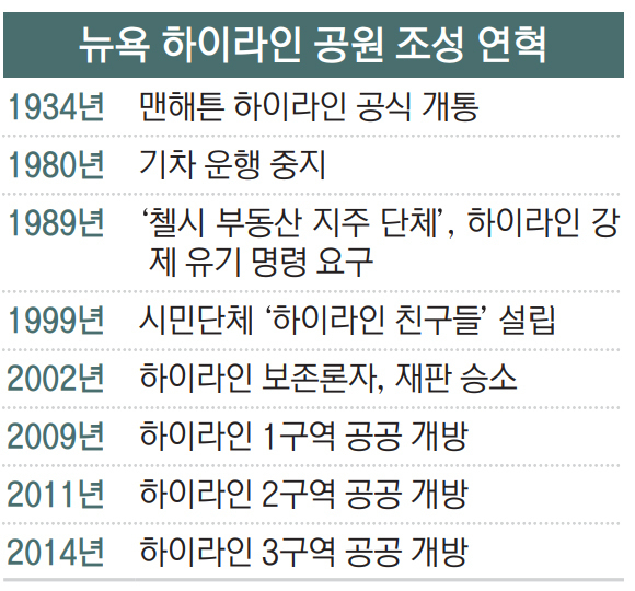 도심 속 흉물이었던 화물 고가철도를 뉴욕의 명물로 바꿔낸 하이라인 공원은 성공적인 도시 재생 사례로 꼽힌다. 뉴욕 맨해튼 도심을 가로질렀던 고가 위 철도차량이 떠난 자리에는 이제 사람들이 모여든다.