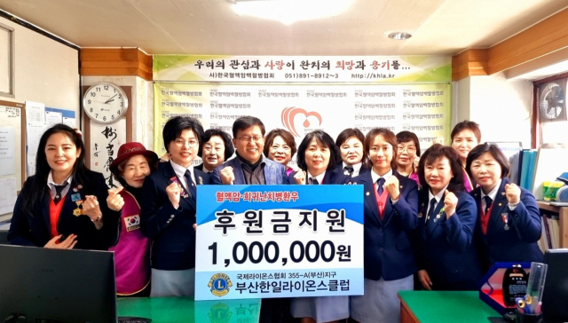 국제라이온스협회 335-A지구 한일라이온스클럽(회장 노향무)은 최근 부산 연제구 연산동 협회 사무실에서 (사)한국혈액암백혈병협회 (회장 정만채)에 후원금 전달식을 가졌다.