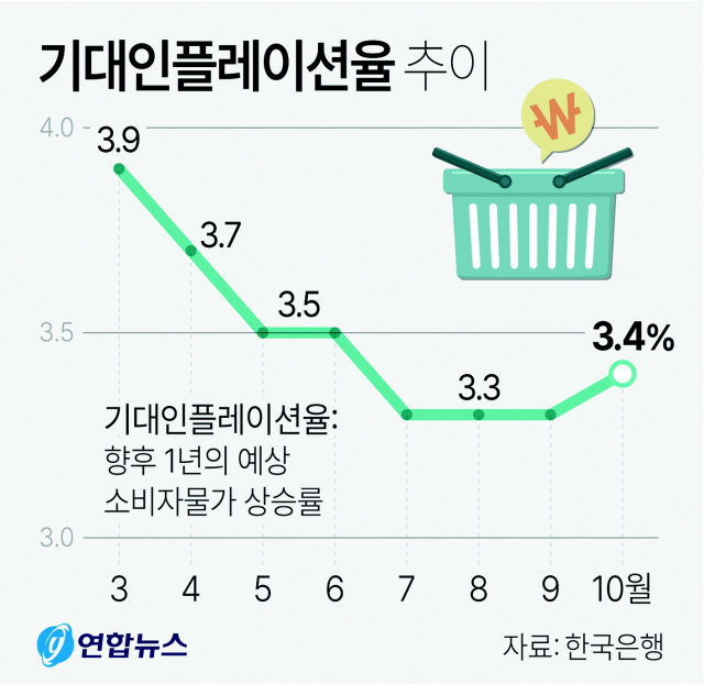 한은이 25일 발표한 ‘10월 소비자동향조사’ 결과에 따르면 10월 기대인플레이션율은 3.4%로 집계돼 9월(3.3%)보다 0.1%포인트(P) 올랐다. 기대인플레이션율이 상승한 것은 지난 2월 이후 8개월 만이다. 한은 관계자는 “이스라엘과 하마스의 전쟁 등 영향으로 국제 유가 오름세에 대한 불확실성이 커졌다”고 배경을 설명했다.
