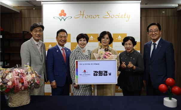 아너 소사이어티는 사랑의열매가 운영하는 1억 원 이상 고액 기부자 모임이며, 강희경 기부자는 5년간 1억 원 기부를 약정하며 부산 340호 아너 소사이어티 회원이 됐다.