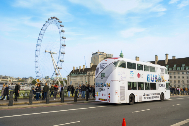 2030월드엑스포 개최지 결정이 한 달 앞으로 다가왔다. 사진은 부산엑스포 홍보를 위한 'LG 엑스포 버스'가 영국 런던의 대표적 랜드마크인 런던아이 인근을 지나는 장면. LG 제공