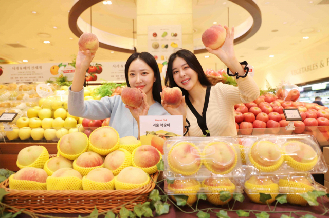 신세계백화점이 전북 순창 지역에서 기준당도 15브릭스 이상의 상품을 엄선한 겨울 복숭아 ‘설숭아’를 선보인다. 모델이 겨울 복숭아 설숭아를 선보이는 모습. 신세계백화점
