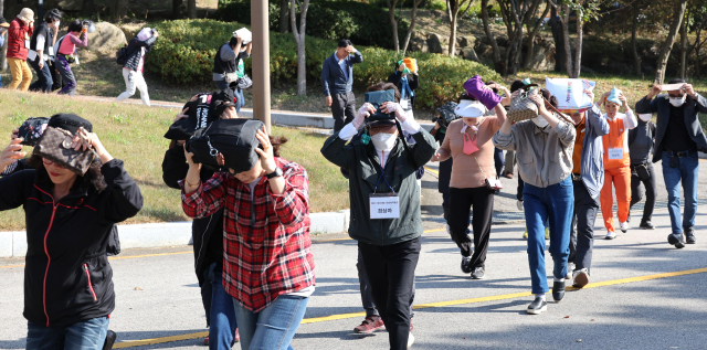 ‘2023 재난 대응 안전 한국훈련’이 열린 26일 오후 부산 북구 금곡동 인재개발원에서 6.2 규모의 지진 발생 상황을 가정해 지진 상황 전파와 대피, 건물 붕괴 등에 대비한 훈련이 진행됐다.