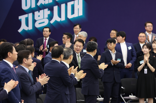 윤석열 대통령이 지난 9월 14일 부산 남구 부산국제금융센터(BIFC)에서 열린 대통령 직속 지방시대위원회의 '지방시대 선포식'에 입장하며 인사하고 있다. 연합뉴스