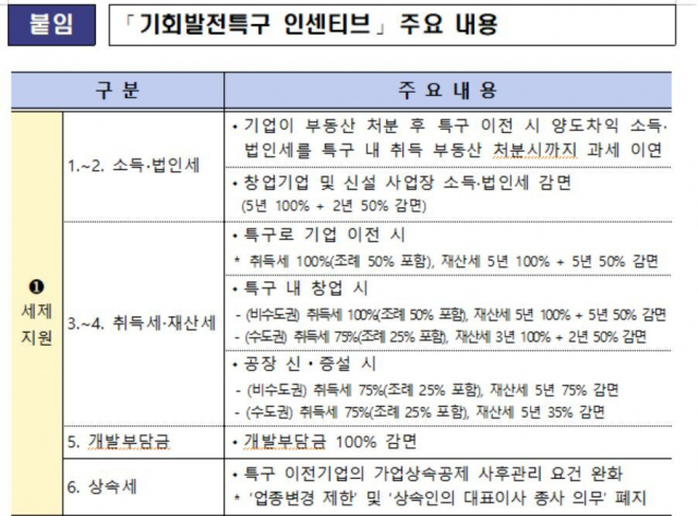 구체적으로는 특구 내 창업기업 및 신설 사업장에 대해 5년간 소득세와 법인세를 100% 면제하고, 이후 2년 동안은 소득세·법인세를 50% 깎아준다. 기업이 특구로 이전하거나 비수도권 특구 내 창업할 경우엔 공히 취득세를 100% 면제하고 재산세를 5년간 100%, 이후 5년간 50% 감면해준다.