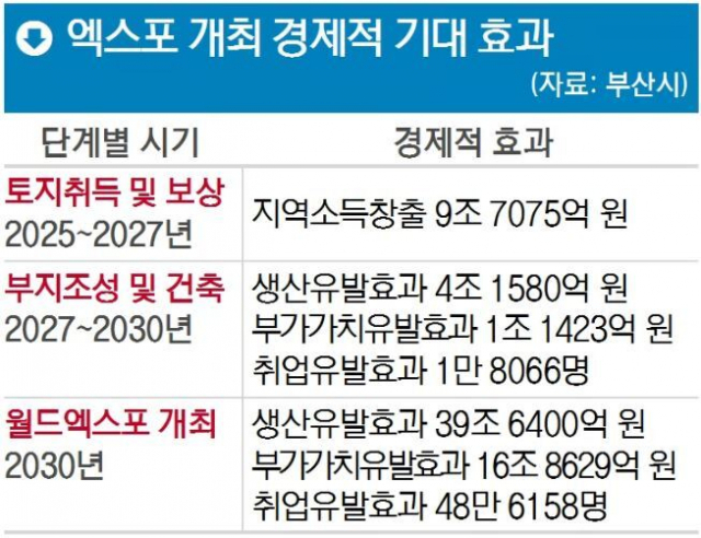 이후 2030년까지 박람회장 부지 조성과 건축 단계에서는 4조 1580억 원의 생산유발효과, 1조 1423억 원의 부가가치유발효과를 합해 총 5조 3003억 원의 경제 효과와 1만 8000명 이상의 취업유발 효과를 가져올 것으로 추정됐다. 이어 월드엑스포가 개최되는 2030년에는 행사 운영과 관광객 지출을 통해 56조 5029억 원의 경제효과와 48만 6000명 이상의 취업유발 효과가 발생할 전망이다.
