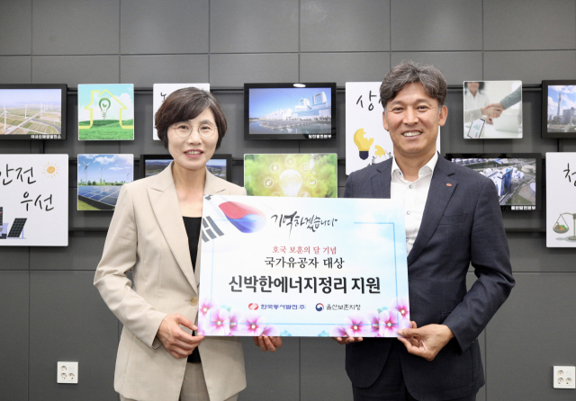 한국동서발전 본사에서 열린 국가유공자를 위한 '신박한 에너지 정리' 14호·15호 전달식(왼쪽부터 이순희 울산보훈지청장, 김영문 동서발전 사장). 한국동서발전 제공