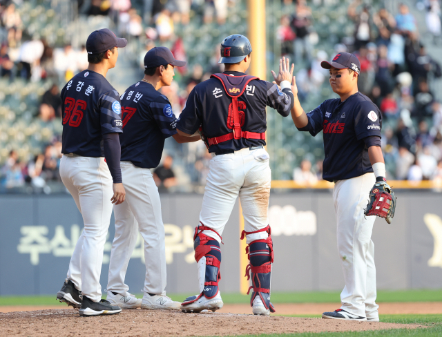 지난 9일 오후 서울 잠실야구장에서 열린 2023 프로야구 롯데 자이언츠와 LG 트윈스의 경기에서 8-1로 승리를 거둔 롯데 선수들이 서로를 격려하고 있다. 연합뉴스