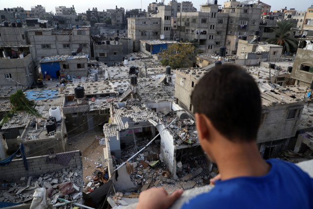 가자지구의 한 소년이 29일(현지 시간) 이스라엘의 공습으로 파괴된 가자지구 시가지를 바라보고 있다. 신화연합뉴스