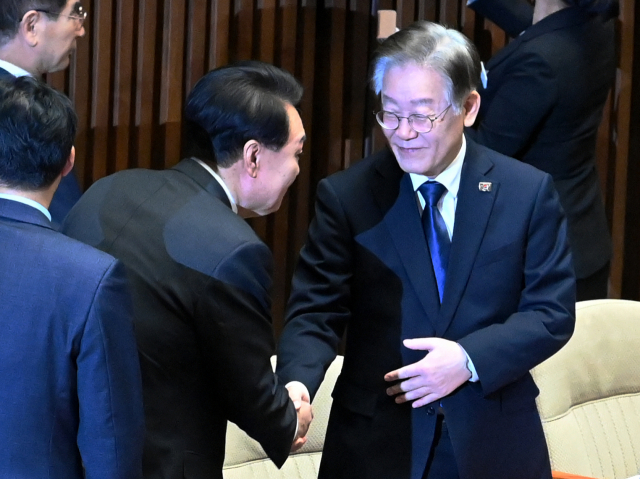 31일 오전 2024년도 예산안 및 기금운용계획안에 대한 시정연설을 위해 국회를 찾은 윤석열 대통령이 본회의장에 들어서며 더불어민주당 이재명 대표와 악수하고 있다. 연합뉴스