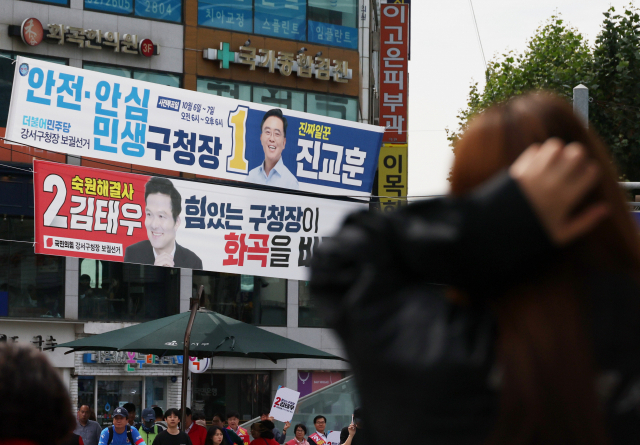내년 총선을 앞두고 정치권에서 논의되는 ‘석패율 제도’와 관련, ‘동시입후보제’의 넓은 틀에서 추진돼야 한다는 지적이 나왔다. 지난달 서울 강서구청장 보궐선거 당시 후보 현수막. 연합뉴스