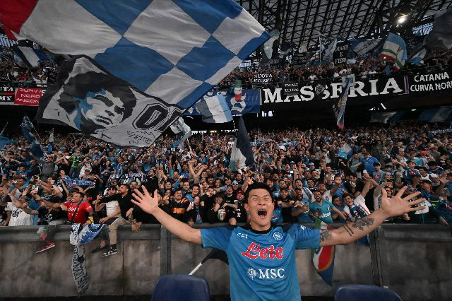 김민재가 2022-2023시즌 SSC나폴리의 중앙 수비수로 활약하며 33년 만에 팀의 세리에A 우승을 이끌었다. 지난 5월 디에고 아르만도 마라도나 스타디움에서 열린 우승 축하연에서 홈 관중들의 열렬한 환호를 받는 김민재. EPA연합뉴스