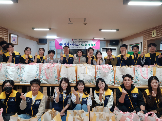 이날 LG유플러스 부산고객센터 직원 20여 명과 봉사자들은 직접 장 본 배추로 겉절이를 만들고, 불고기, 과일 등을 담아 위기가정 40세대에 배달했다.