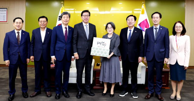 중소기업중앙회(중기중앙회) 김기문 회장은 1일 오전 부산 연제구 부산시청에서 박형준 부산시장에게 ‘2030부산세계박람회 응원 등불’을 전달했다.