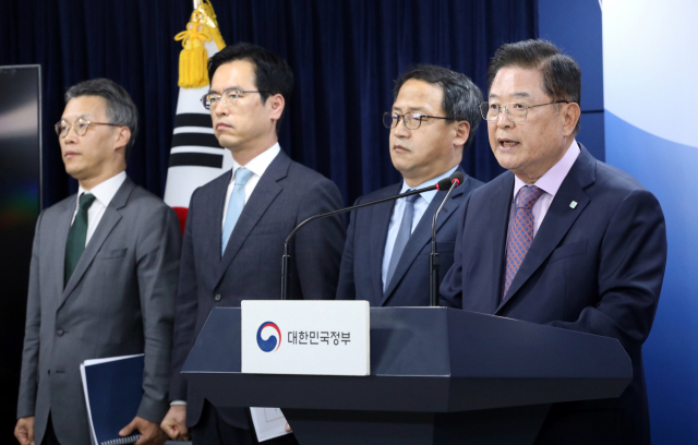우동기(맨 오른쪽) 대통령 직속 지방시대위원장이 지난달 31일 정부 서울청사에서 열린 사전 브리핑에서 ‘윤석열 정부, 지방시대 종합계획’을 발표하고 있다. 연합뉴스