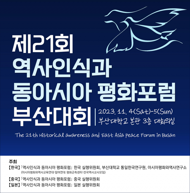「역사인식과 동아시아 평화포럼」 한국 실행위원회(아시아평화와역사교육연대·참여연대 평화군축센터·전국역사교사모임)와 아시아평화와역사연구소, 부산대 통일한국연구원은 중국·일본의 평화포럼 실행위원회와 공동으로 「제21회 역사인식과 동아시아 평화포럼 부산대회」를 4일과 5일 이틀간 부산대 본관 3층 대회의실에서 개최한다고 2일 밝혔다.