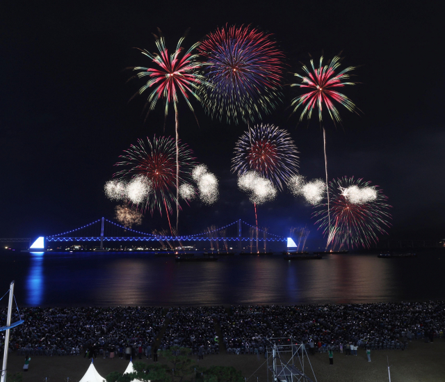 [포토뉴스] '2030부산엑스포 유치 기원' 밤바다 수놓는 불꽃