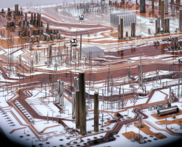 “초등학교 3학년 때 거제도에서 부산으로 이사를 왔어요. 갑자기 환경이 바뀌며 사춘기를 심하게 겪었어요.” 다른 세상과 환경을 갈망하던 중학생은 애니메이션·사이버펑크 문화에 빠져 들었다. PCB를 이용한 작업도 이런 취향의 연장선에 놓여 있다. 김 작가는 메인보드 위에 정교하게 가공된 가상의 공간을 구축했다. “PCB에서 회화적인 것을 발견했어요. 조각 같은 입체 기반의 전공을 했으니 오브제로 회화를 했다고 볼 수 있죠.”