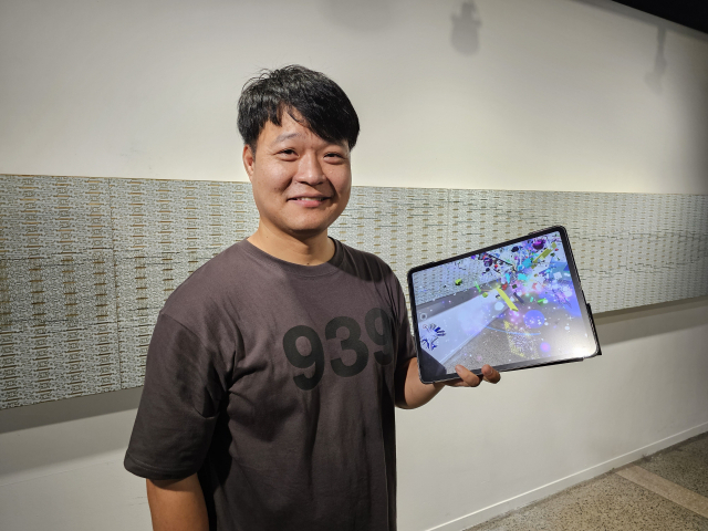 김봉관 작가가 부산 중구 중앙동 전시장에서 아날로그 작품 ‘은하수’를 통해 구현되는 AR 이미지를 태블릿PC로 보여주고 있다. 오금아 기자